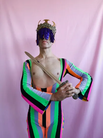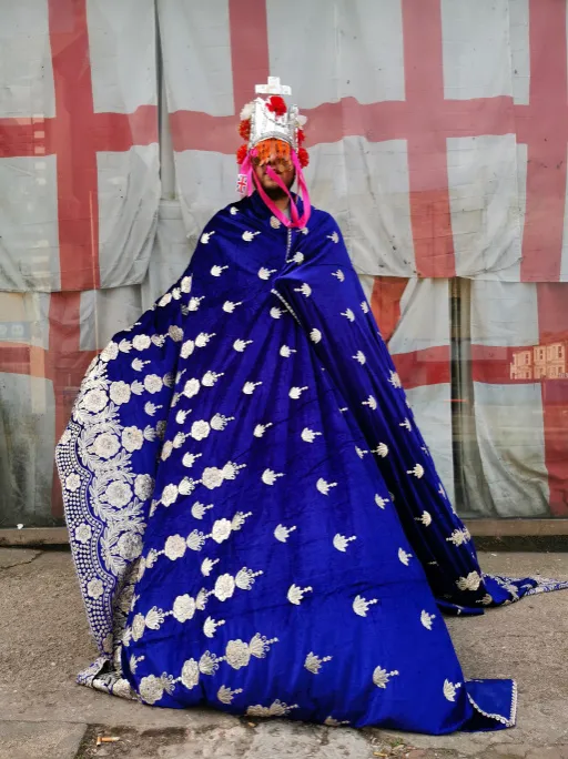 The artist finds inspiration in the portraits of royals and important people found in big museums. He invites his models to emulate their poses, at the same time dressing them up with gadgets and replica items that reference regalia, luxury and the upper classes, combined with tools used by the historiantes of El Salvador in their daily jobs, such as machetes and other agricultural implements. This visual strategy is an intersectional commentary on the extractivist policies of colonial settlers in the Central American country at the same time as on the social status of the original peoples. By appropriating the European canon to portray a tradition that has barely been documented, the artist symbolically elevates folkloric dances to the standards of high European art and inserts the stories they tell as part of a universal history.