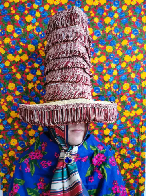 The images are crowded with cultural references other than Salvadoran, owing to the artist’s lack of access to traditional objects from his country of birth, or their total absence in the global market. To construct his photographs, he has to borrow commodities from cultures that share a common history of colonisation, using wax prints from West African traditions, for example, or the Palestinian keffiyeh; but he also uses English nationalist symbols. Studio Lenca recognises this laborious and disappointing process of searching and not finding authentic cultural signifiers from El Salvador in his work by dubbing the images ‘photographic performances’.