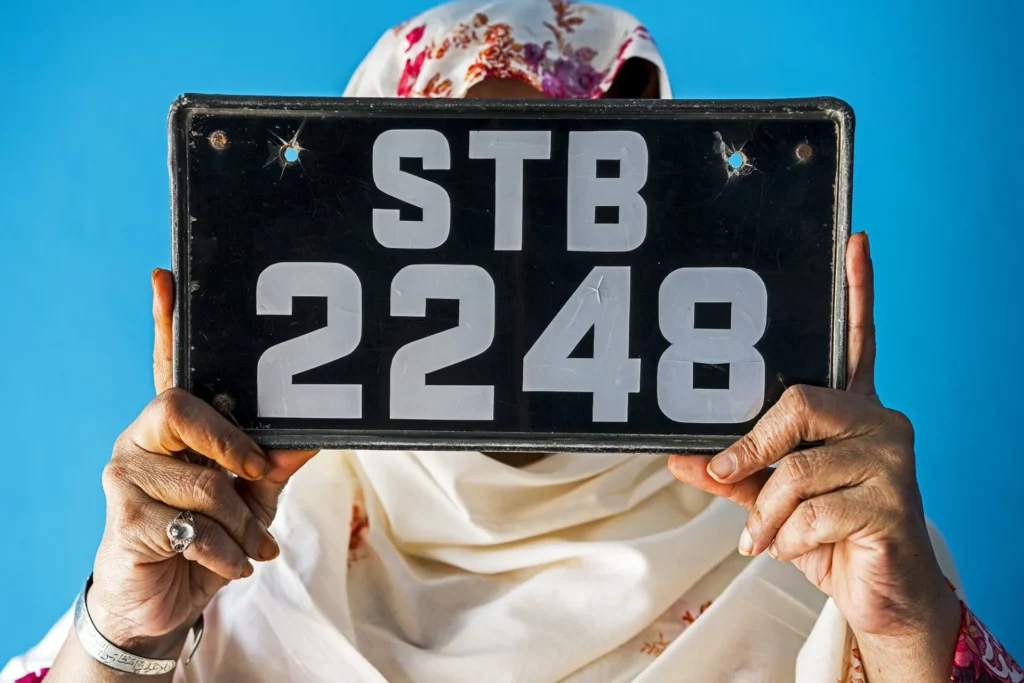 Aunty Chubo Holding Rear License Plate, 2016. Courtesy of Sayed Sattar Hasan.