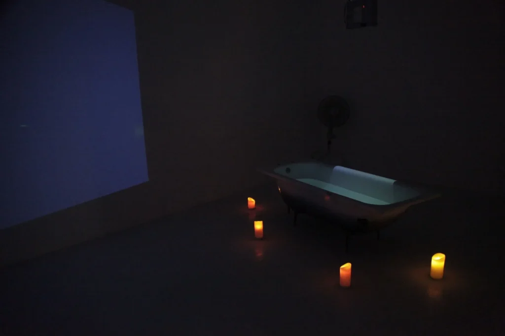 The installation consists of a video taken during a night prayer session, accompanied by a letter written to Nankondo by my mother, and in conversation with her. The text is projected on a bathtub filled with water and surrounded by lit candles. The work tries to make sense of the self-loath and spiritual abyss as displayed by modern day society as residues of history.