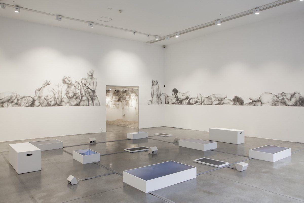 She Summons an Army was the next piece as I moved through the exhibition. It consisted of a series of drawings on paper depicting naked women with eye-shaped heads captured in playful motion but above all, performing acts of support and care for each other.