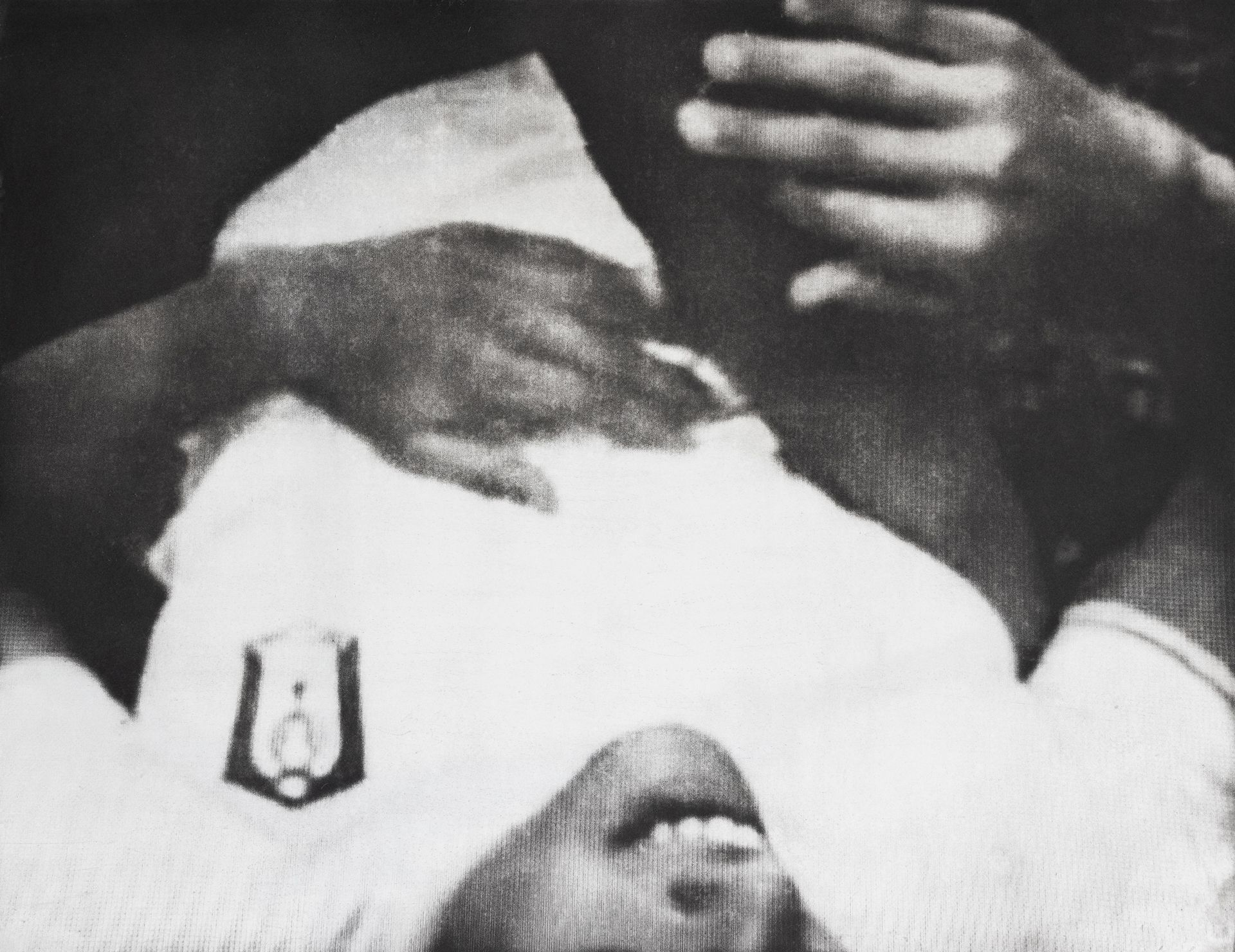 I began by accumulating an archive of found videos that Peruvian teens engaged in this game posted on the Internet. I then selected stills, which were transformed into enormous copper etchings with which we made beautiful prints through the aquatint photogravure process, merging 21st- and 19th-century processes. The result is a series of images akin to obscure memories that depict bodies vacillating between torture and pleasure. My intention is to place the viewer in the position of having to decide whether they’re witnessing violence or playful intimacy.