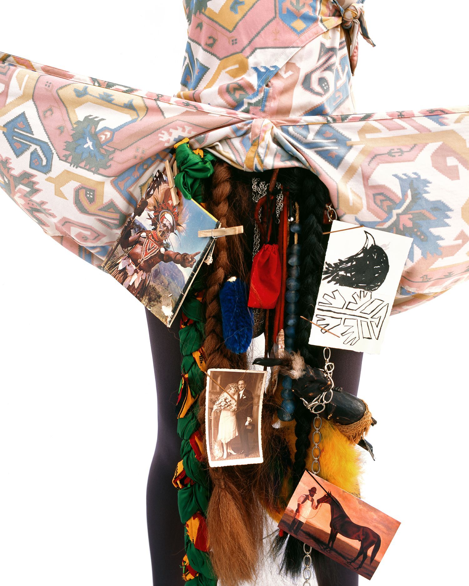 Singular figures also appear in each of the works in Simmons’s Index series, but instead of holding individual archival images, they hold a ‘whole archival shape’. The figures are constructed by way of assemblage, indicating the artist’s preoccupation with sculpture. Each one presents a collection of artefacts and images hanging from the waist down, whereas the top part of the body is covered by fabrics, thereby concealing the individual’s face, arguably, the utmost signifier of identity. Index presents different subjects as defined by their cultural baggage, reflecting on the multi-faced nature of identity and questioning how identity can be defined – or if it is even possible to do so.